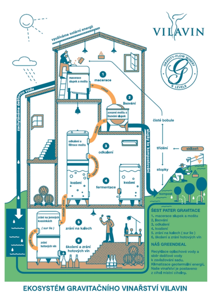 Nově vystavěná budouva vinařství v duchu funkcionalismu dává smysl jedině s plně gravitačním zpracováním. Dochází tak k tradičnímu způsobu přemísťování suroviny mezi jednotlivými operacemi gravitací, ale přitom v moderním pojetí výroby s použití kryomacerace, řízeného kvašení i battonage. Šestipatrové gravitační vinařství je unikátní stavbou, kde forma následuje funkci, a tím zajišťuje zpracování zcela bez čerpadel.